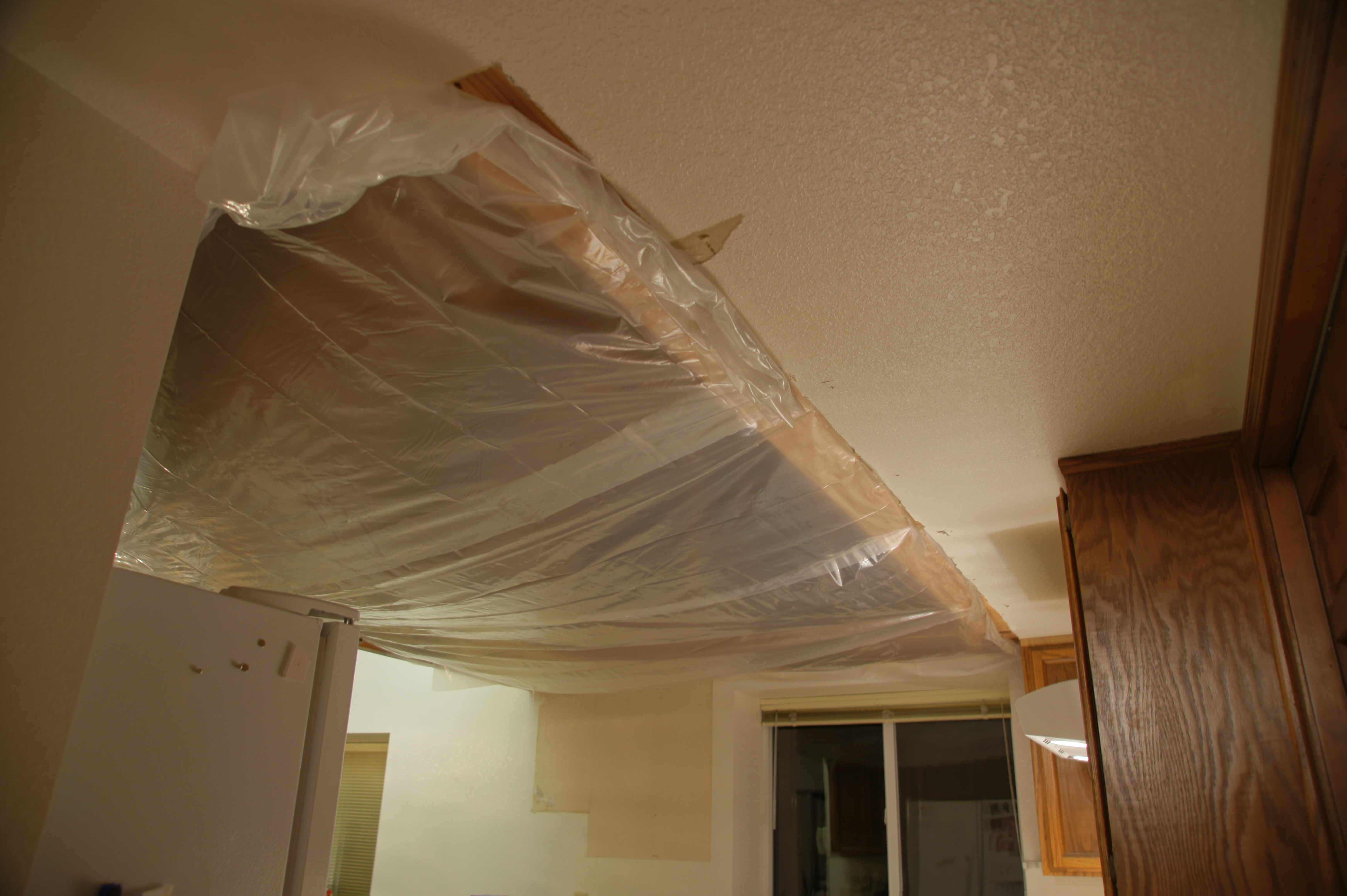 Shadow just loved jumping up into the ceiling and in the process dragging down a bunch of the blow-in fiberglass insulation. Victoria's cats were here this weekend and I was worried they would also try to get up. Also, it was 102 this weekend, so the plastic helped (a little) keep the kitchen from feeling like a sauna.