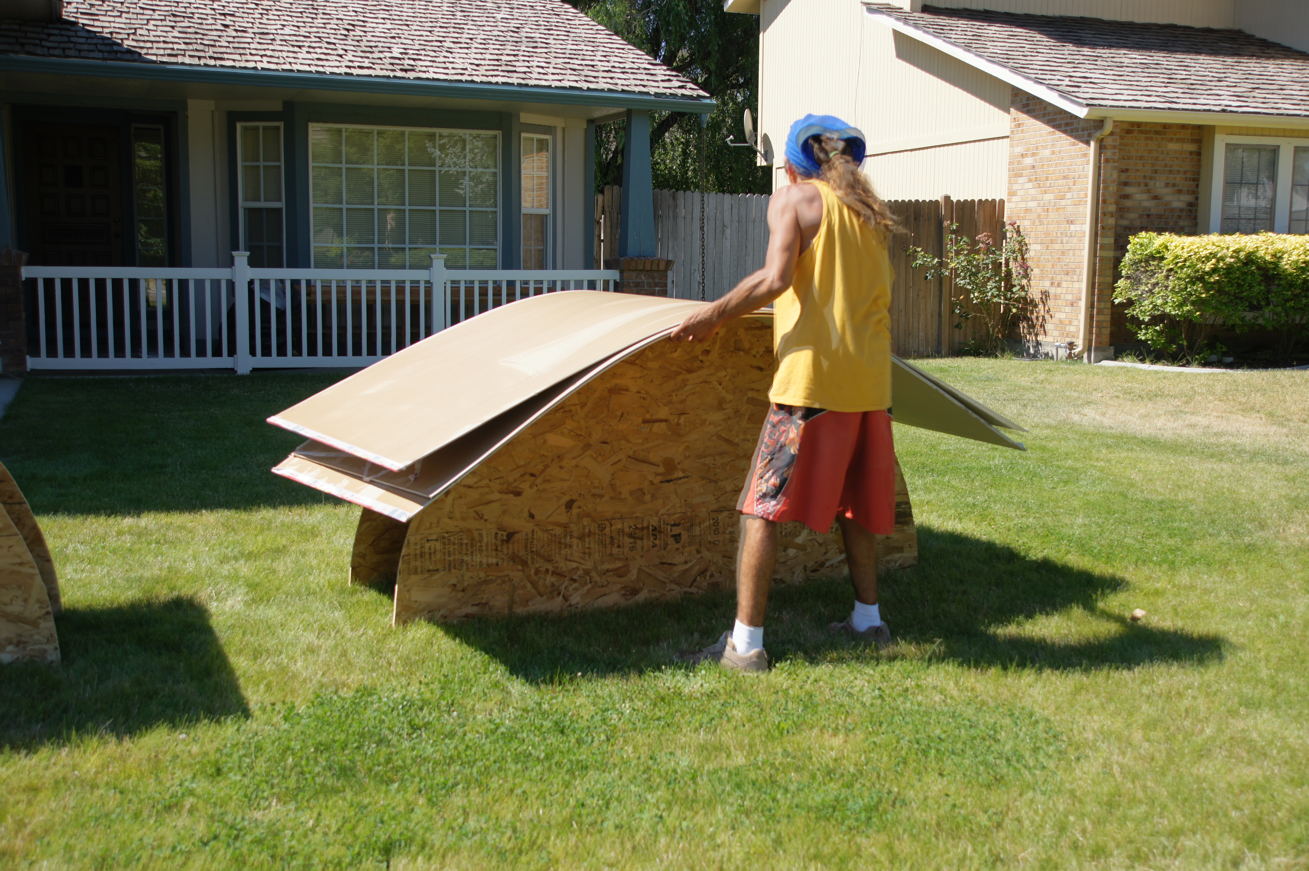 The forms are the cut-outs from the particle board that was used to build the arch. They lay the sheetrock over the form and slowly wet the back of the boards. The rock conforms to the forms and then hardens in the sun. Apparently the trick is in just how much water to use (not much) and how slowly you bend the boards. They had clearly done this many times before (mostly for curved walls they said).