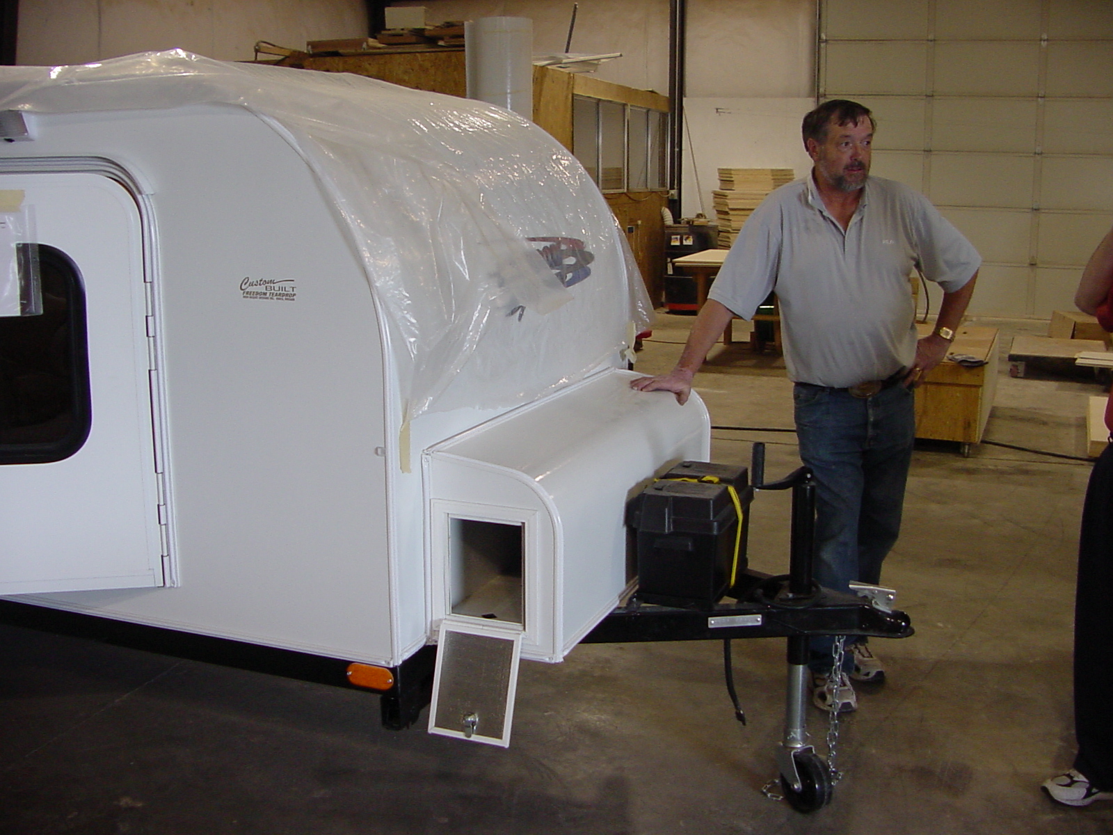 The owner/manufacturer leaning on the front storage locker with the battery container just in front of that.