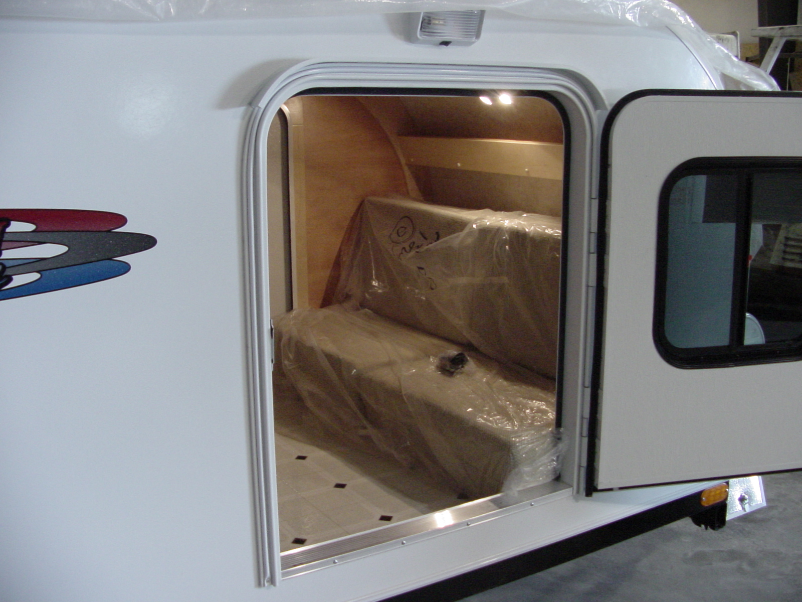 Enother shot of the "couch" bed. Here you can see that the floor of the trailer is coverd with lanolium. You can als